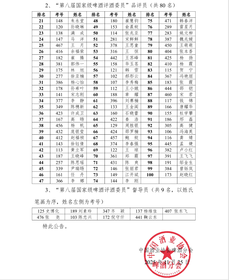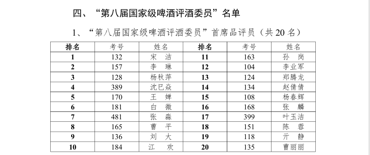 本次考评不仅为行业选拔出新一届国家级啤酒感官人才队伍,也进一步推动了啤酒行业感官评价体系的完善与专业水平提升。详细名单如下: