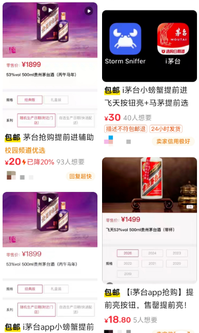 在某二手交易平台上,有人高价倒卖贵州茅台酒,还有人出售相关“教程”,教消费者利用“外挂”工具抢购。