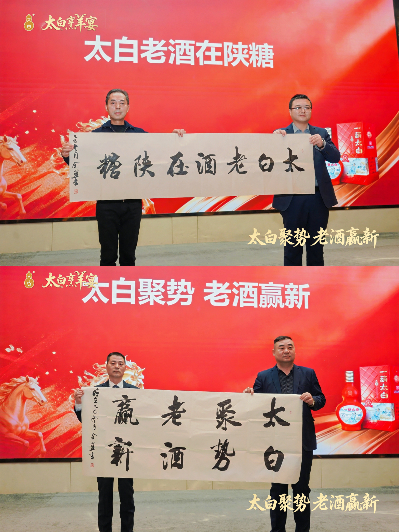 现场,陕西省黄楼书画会名家相继赠送“太白老酒在陕糖”、“太白聚势 老酒赢新”等墨宝,以翰墨点睛品牌风骨。