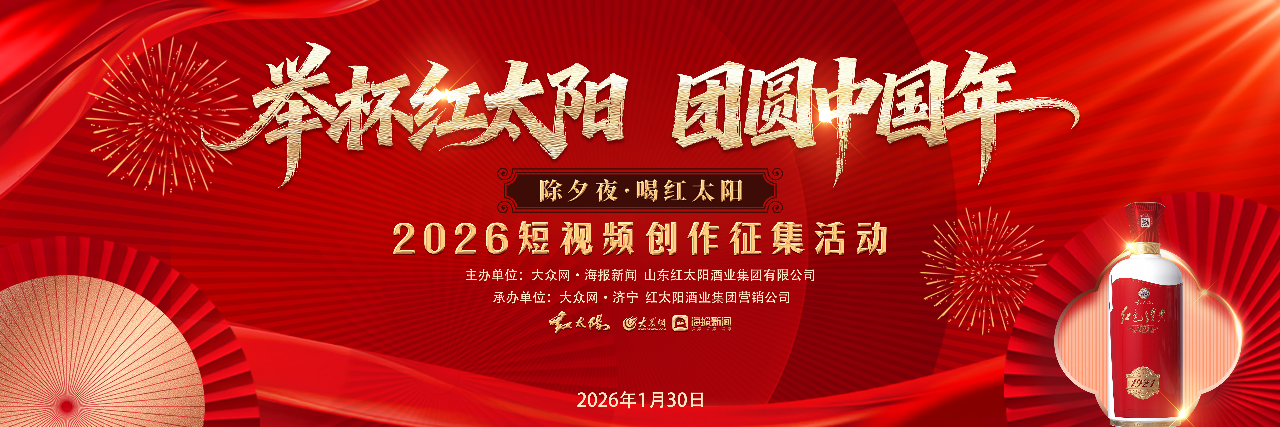 值此新春佳节来临之际,红太阳酒业集团携手大众网·海报新闻,正式发起“举杯红太阳 团圆中国年”除夕夜·喝红太阳2026短视频创作征集活动。诚邀全国消费者、创作达人、文化爱好者,用镜头捕捉除夕夜的团圆时光,让每一杯红太阳酒,都成为您故事中最动人的注脚。