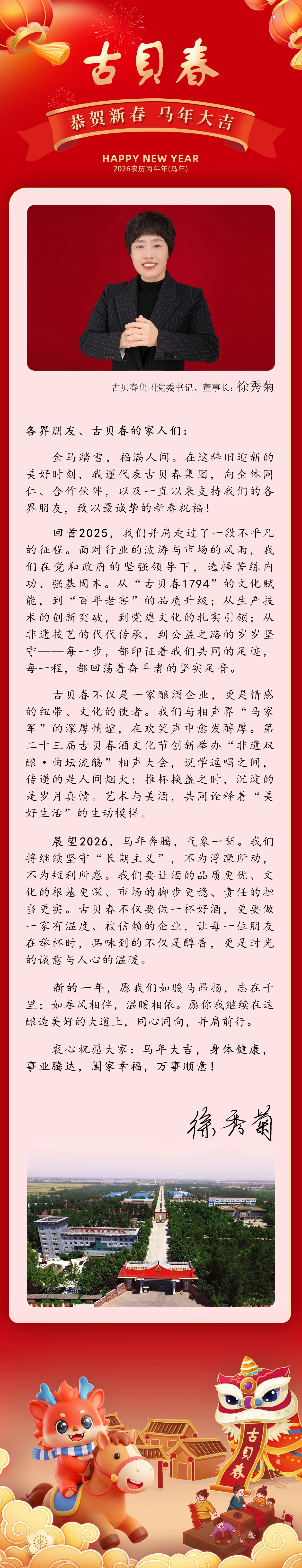 古贝春集团有限公司党委书记、董事长徐秀菊携全体员工恭祝全国人民新春快乐!
