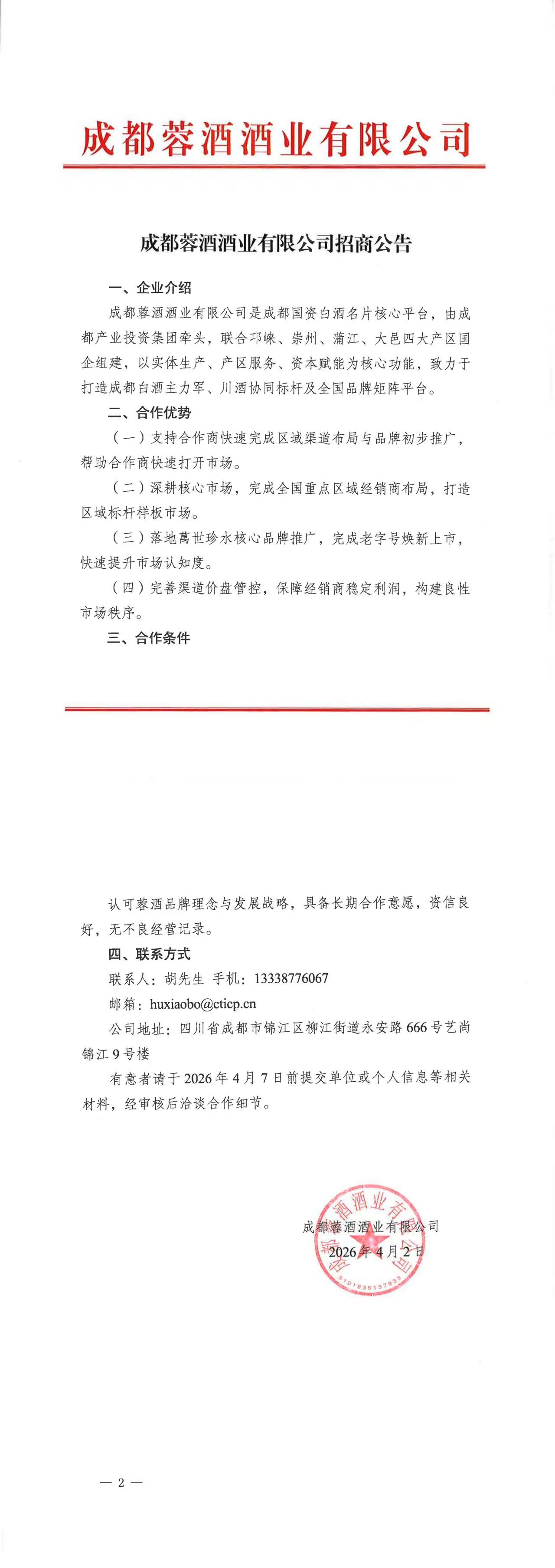 4月2日,成都蓉酒酒业有限公司(简称:蓉酒公司)正式发布招商公告,面向全国诚邀优质经销商合作共赢。