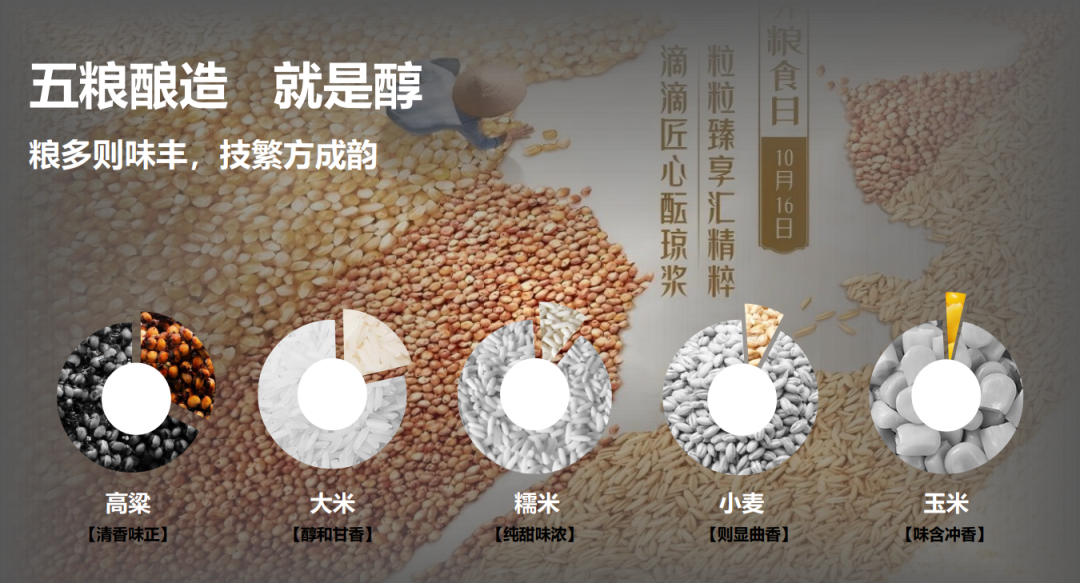 高粱的清香味正、大米的纯甜味浓、糯米的醇和甘香、小麦的曲香、玉米的冲香……五粮共酿,层次丰盈,入口绵柔却不失骨架,回甘悠长却不带杂味。每一口,都是大地馈赠的交响。