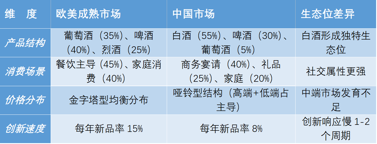 其次是生态位定位。文化独占区,白酒作为中国独有的蒸馏酒品类,占据全球烈酒市场25%的份额;结构失衡,高端白酒占据中国酒类利润的65%,但仅占销量的8%;国际短板,中国酒类出口仅占全球贸易额的2.3%,而法国葡萄酒占全球葡萄酒贸易的29%。
