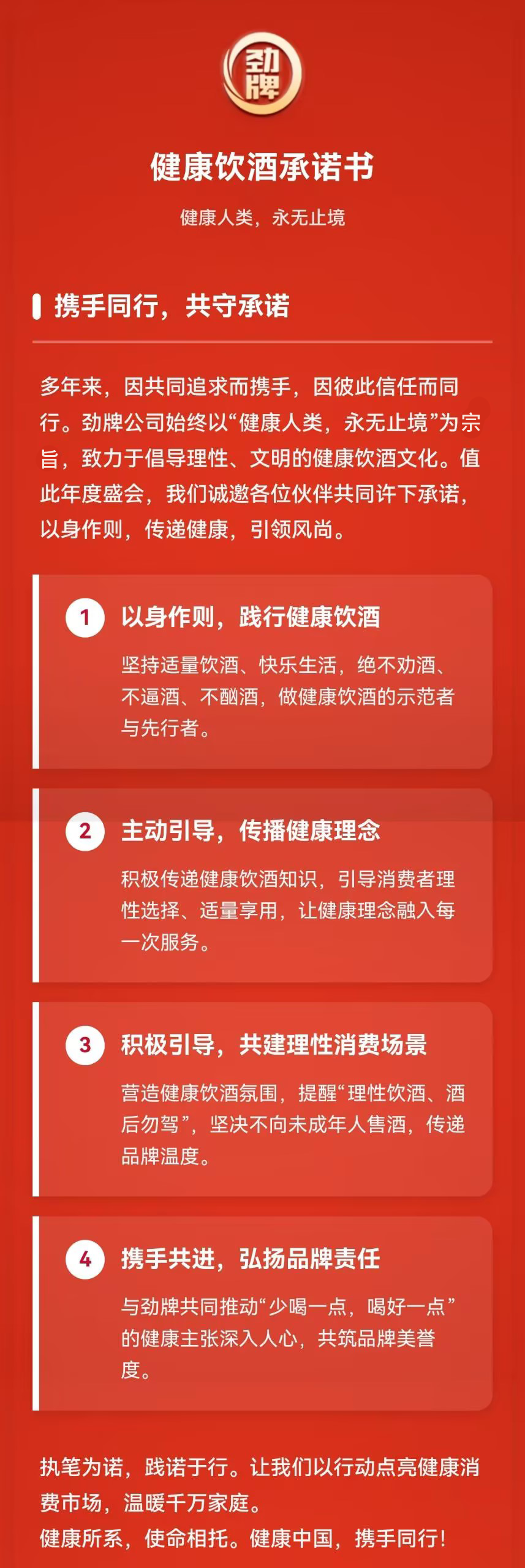 本次签订承诺书,是劲牌健康理念从企业内部向全渠道延伸的关键一步。未来,劲牌将与全体经销商携手同行,以身作则向消费者普及健康饮酒知识,践行理性饮酒、文明饮酒,拒绝酗酒,共同做健康饮酒的示范者与先行者,以责任引领健康生活新风尚。