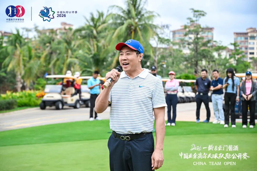 云门酒业海南运营中心总经理董传亮为赛事致辞,并与北京奥邦华创体育发展有限公司董事长、赛事执行主任孙立平,一龄医院管理集团会务处处长、一龄高尔夫球精英医养俱乐部副秘书长兼活动策划与组织委员会主任袁丞丰,海南清水湾高尔夫球会总经理何冠军共同为比赛开出彩球,拉开本站赛事帷幕。
