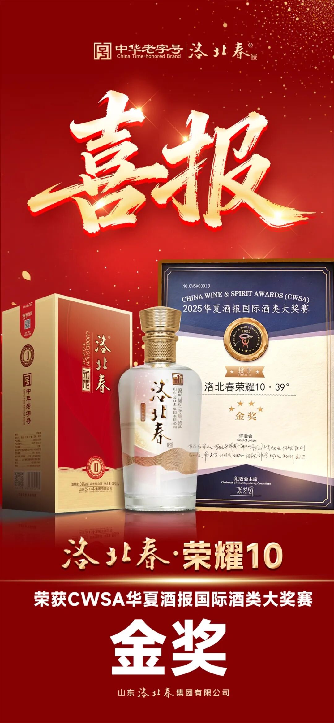 洛北春荣耀 10 勇夺「CWSA 华夏酒报国际酒类大奖赛金奖」!作为洛北春集团 2025 年重磅推出的新品力作,这款 39 度浓香型白酒自 2025 年上市以来便备受瞩目,上市即斩获“2025 年山东省酒类产品感官质量评价星级产品”,此次再夺国际金奖,实现 “上市即巅峰” 的荣誉进阶。凭借 “窖香优雅、绵甜柔顺” 的独特风味征服世界味蕾,不仅是其品质实力的双重印证,也为中国白酒赢得国际认可。
