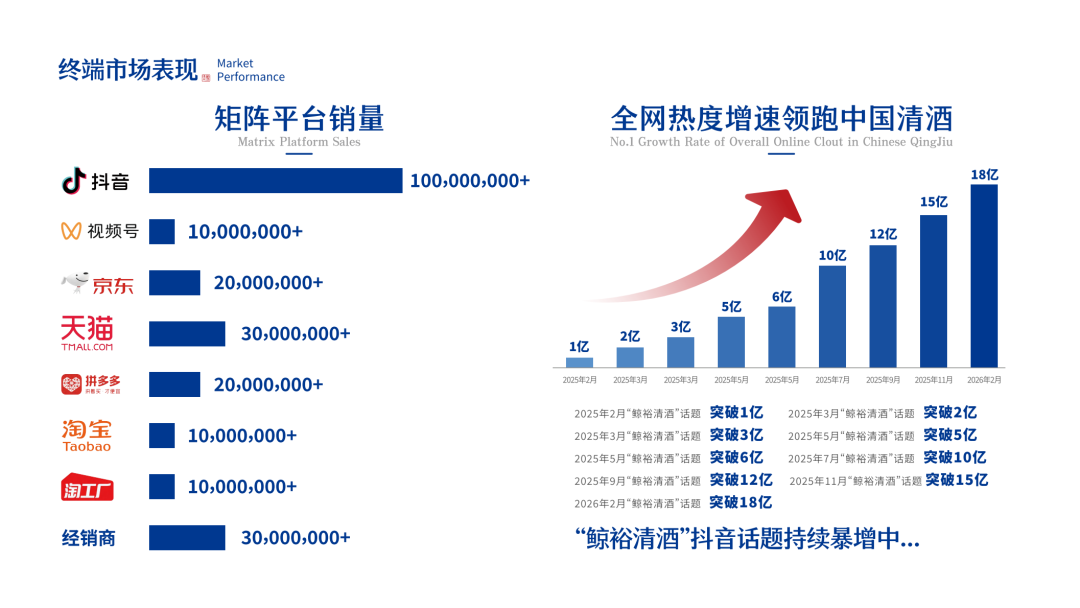 面向2026年,鲸裕清酒发布全新战略布局,以“长期主义”为核心,从品牌、渠道、赋能三大维度全面发力,剑指中华清酒百亿市场。品牌端,启动分众百城投放、国民艺人代言、敦煌/故宫联名三大计划,以国潮文化深化消费者对“中华清酒”的品类认知,打破“清酒=日本”的固有印象;渠道端,线上在抖音、京东、天猫等主流平台持续领跑,线下重点布局中式餐饮、精品商超、即时零售前置仓,已入驻美团3万+网点,构建“品牌-经销商-消费者”营销生态闭环;赋能端,制定合理价格与返利政策,搭建全国仓储物流体系,上线数字化经销商管理系统,组建专业团队提供终端陈列、投流推广等支持,开展专项培训全方位赋能终端动销。