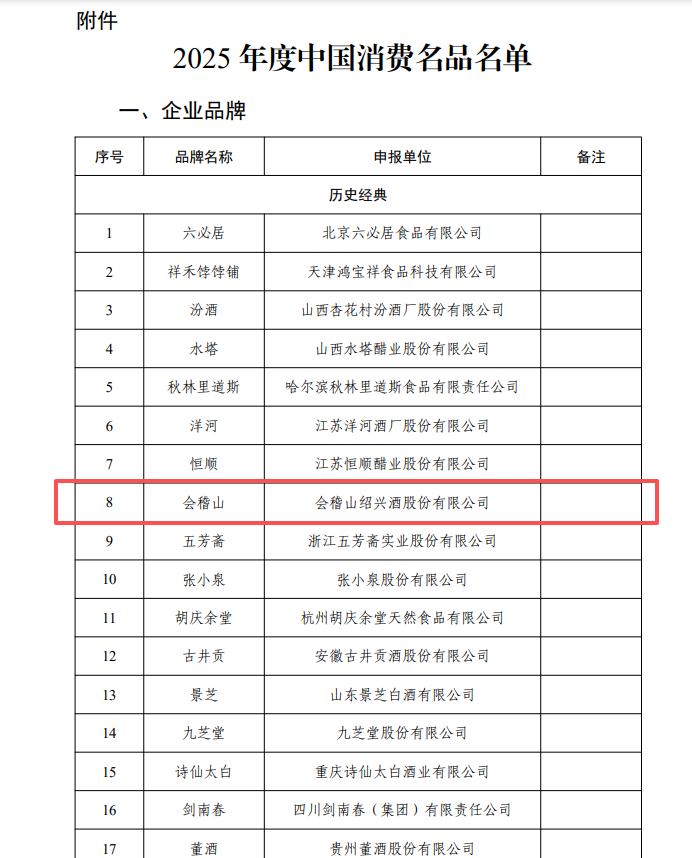 值得关注的是,本次与会稽山一同入选的还有汾酒、洋河、古井贡酒、剑南春、董酒等多家白酒名企。历史总是遥相呼应——1952年,会稽山前身“鉴湖长春酒”曾与汾酒等同台荣获新中国首届八大名酒;七十余年后,两者再次共同跻身国家级消费名品行列,见证了中国酒业经典的传承与延续。