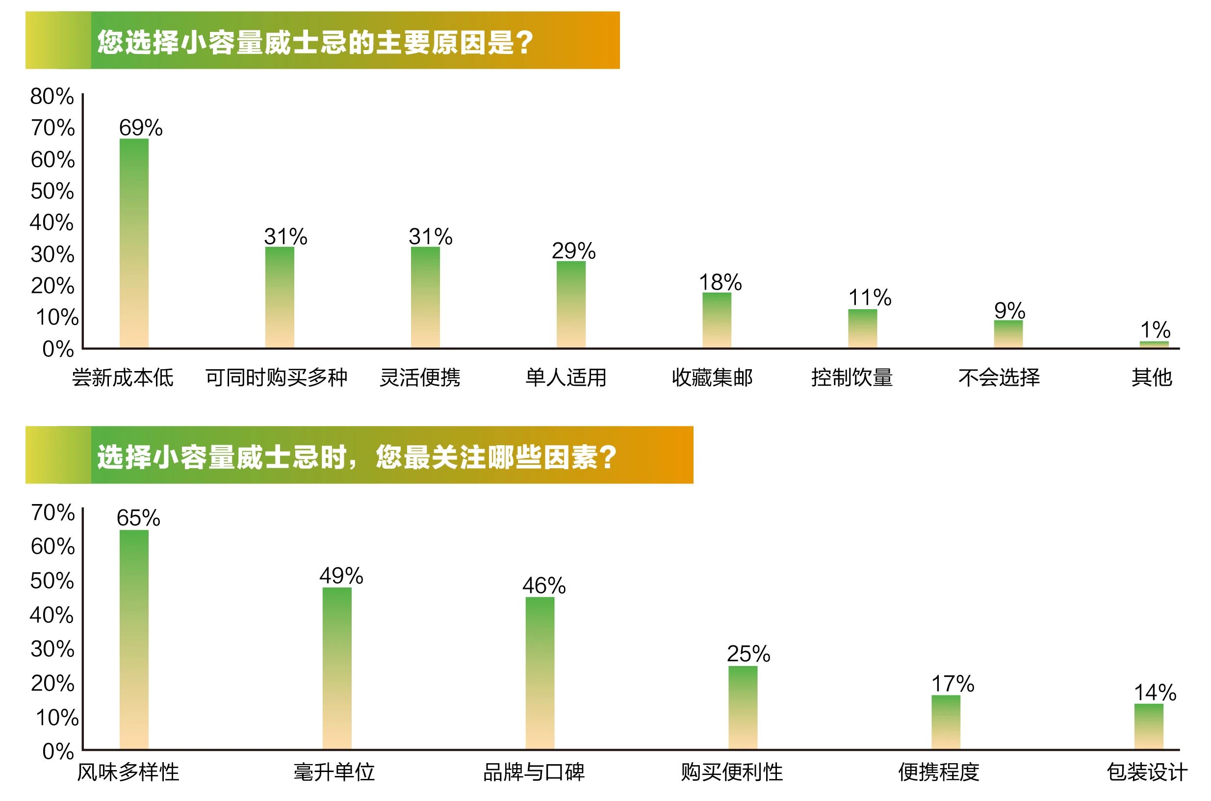 小容量大乾坤:小容量威士忌(50ml、200ml及分享瓶)正成为低成本探索个人风味地图的利器,“尝新成本低”是其选择的首要动因。其中,18岁-29岁的年轻人群是分享瓶的核心拥趸,饮用年限1年以内的新手更是关键驱动力。