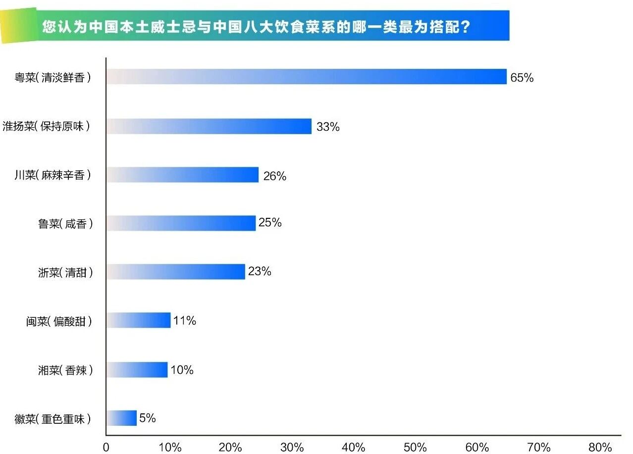 在佐餐场景上,粤菜以65%的绝对优势成为最适配的选择,其“清淡鲜香”的特点,能最大限度地衬托威士忌的层次感。淮扬菜紧随其后,而以川、鲁、浙为代表的麻辣、咸鲜、清甜风味,也分别获得超过两成消费者的青睐,显示出本土威士忌正从传统的“清淡主线”向更多元味型拓宽。