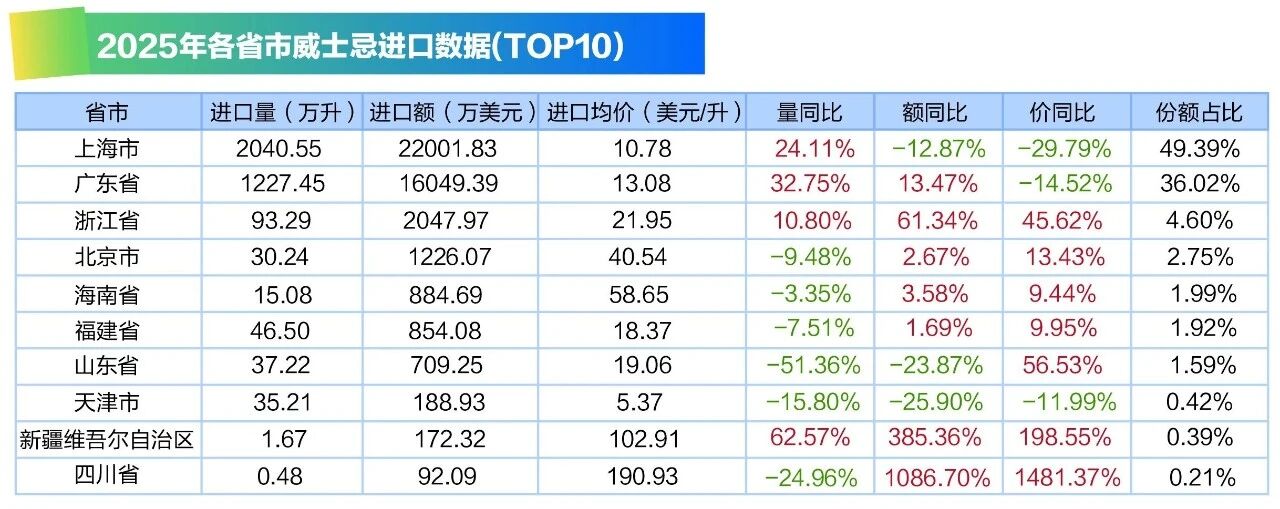 从进口来源地看,英国市场仍为绝对主导,但呈现“量增价跌”的特征;美国市场增长强劲,进口量激增82.2%,以4.15美元/升的低均价驱动大众市场扩容;日本市场则稳居高端价位首位,均价达27.64美元/升。